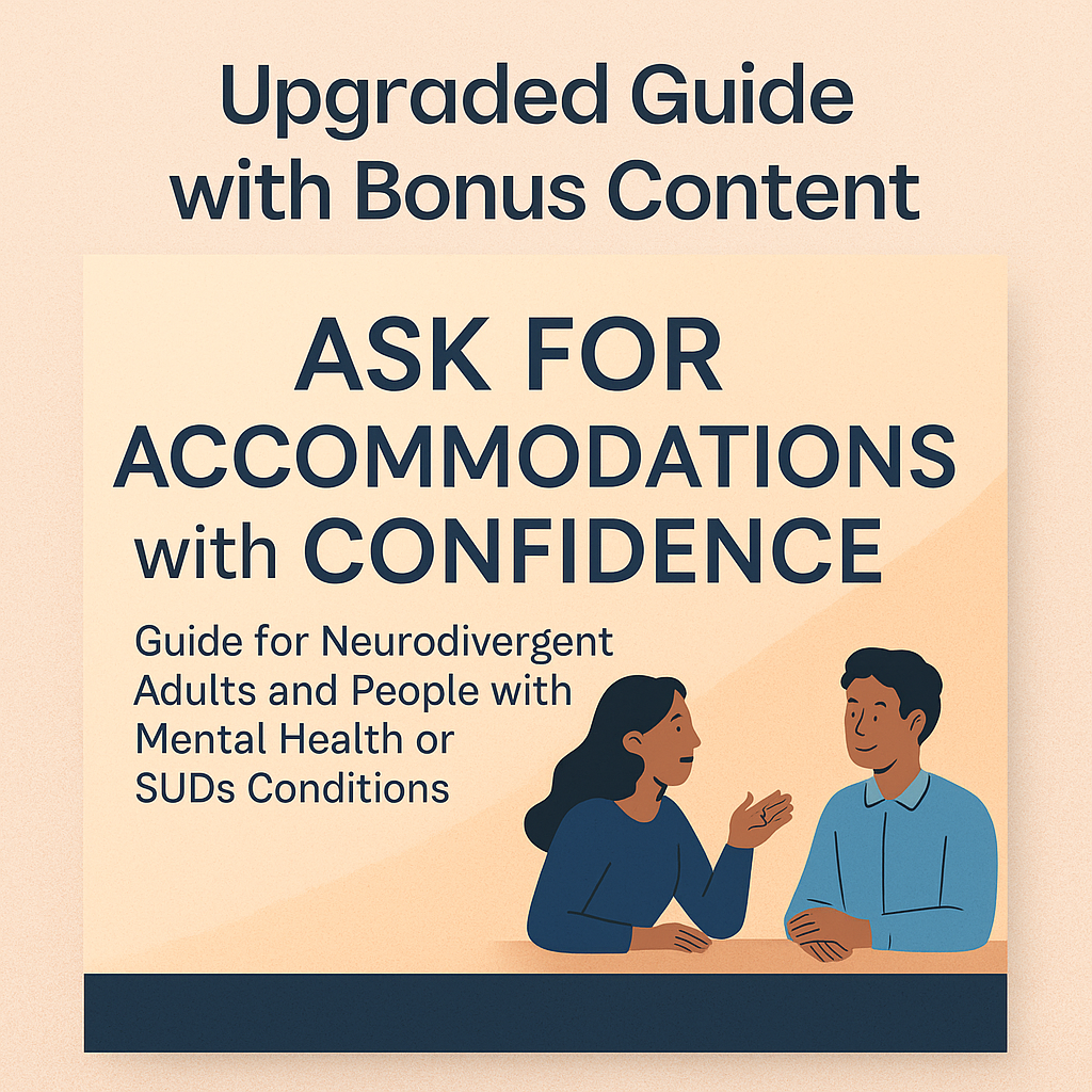 Ask for Accommodations with Confidence – Upgraded with Bonus Content is your all-in-one self-advocacy toolkit for requesting support at work, school, or in healthcare. This upgraded version includes a glossary, proven scripts to respond to typical denials, prep tips, an accommodations tracker, and a short video tutorial to help you navigate the process confidently—without burning out. Perfect for neurodivergent adults and those with mental health or substance use conditions ready to take the next step.